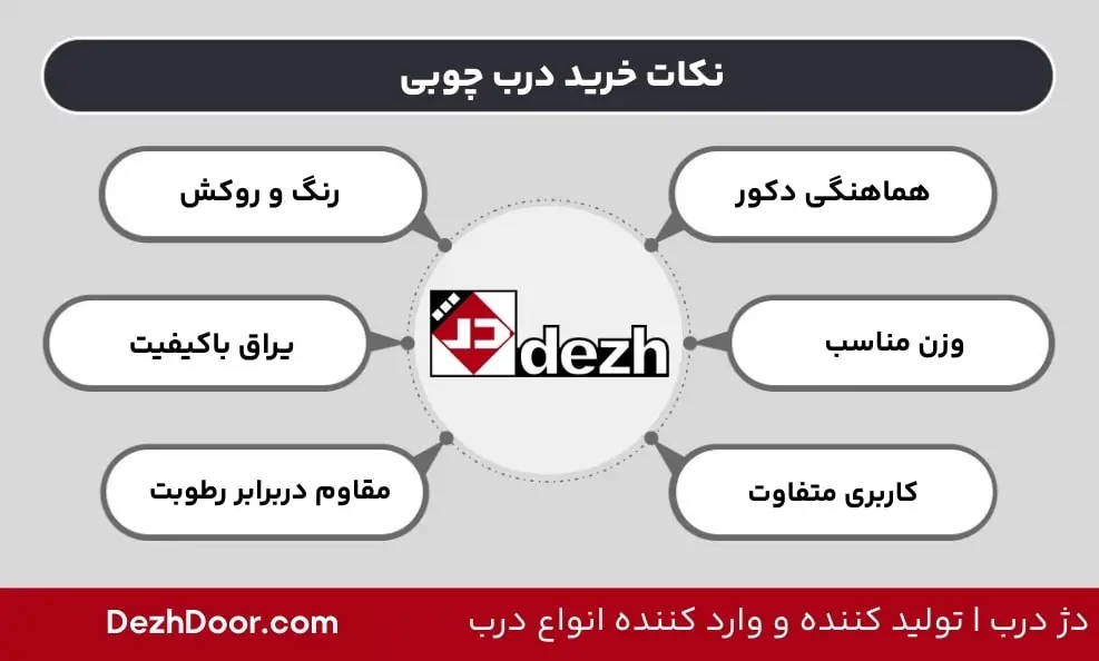 علاوه بر اینکه باید به نوع چوب به کار رفته در درب توجه کرد، باید ابعاد و اندازه آن نیز دقت نمود. روکش درب و رنگ آن نیز برای دکوراسیون داخلی ساختمان شما حائز اهمیت میباشد. در حقیقت دربهای داخلی باید دارای رنگی باشند که با کفپوش به عناصر دیگر دکوراسیون هماهنگی خاص ایجاد کنند. طرح محصول یعنی کلاسیک یا مدرن باد بودن آن نیز اهمیت بالایی خواهد داشت. شما باید هنگام خرید درب چوبی به وزن آن هم توجه کنید.